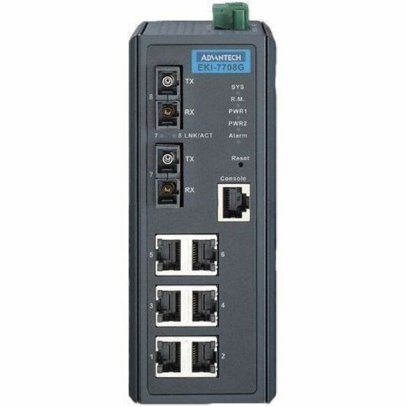 Advantech's EKI-7708G-2MI/2SI are cost effective managed industrial Ethernet switches which support Gigabit Ethernet via built in fiber optic ports. These solutions feature embedded IXM functions to hasten deployment and reduce engineering time/costs. These switches extend transmission distances beyond the 100 m (328 ft) copper cable limitations using fiber port - they support 550 m (1804 ft) in multi-mode and 10 km (6.21 mi) in single mode. The EKI-7708G-2MI/2SI series supports WebAccess/NMS to aid in network maintenance and failure prevention. These managed Ethernet switches deliver ultra-high speed recovery times of <20 ms using X-Ring Pro to ensure network stability. This solution supports broad operating temperatures (-40 ~ 75 °C /-40 ~ 167 °F), for use in traffic applications