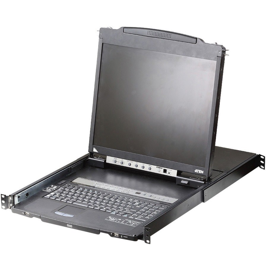 The CL5816N 19" LED-backlit LCD monitor and keyboard/touch pad modules slide independently of each other. To maximize space in your data center, the keyboard/touch pad module slides back to "hide away" when not in use, while the thin profile LCD monitor rotates back - flush against the rack - allowing convenient monitoring of computer activity. Quickly and conveniently switch computer access with station and port selection push button switches located on the keyboard module. Even when the keyboard module is in the retracted position you can still switch access with the Port Up/Port Down push buttons located on the monitor module.