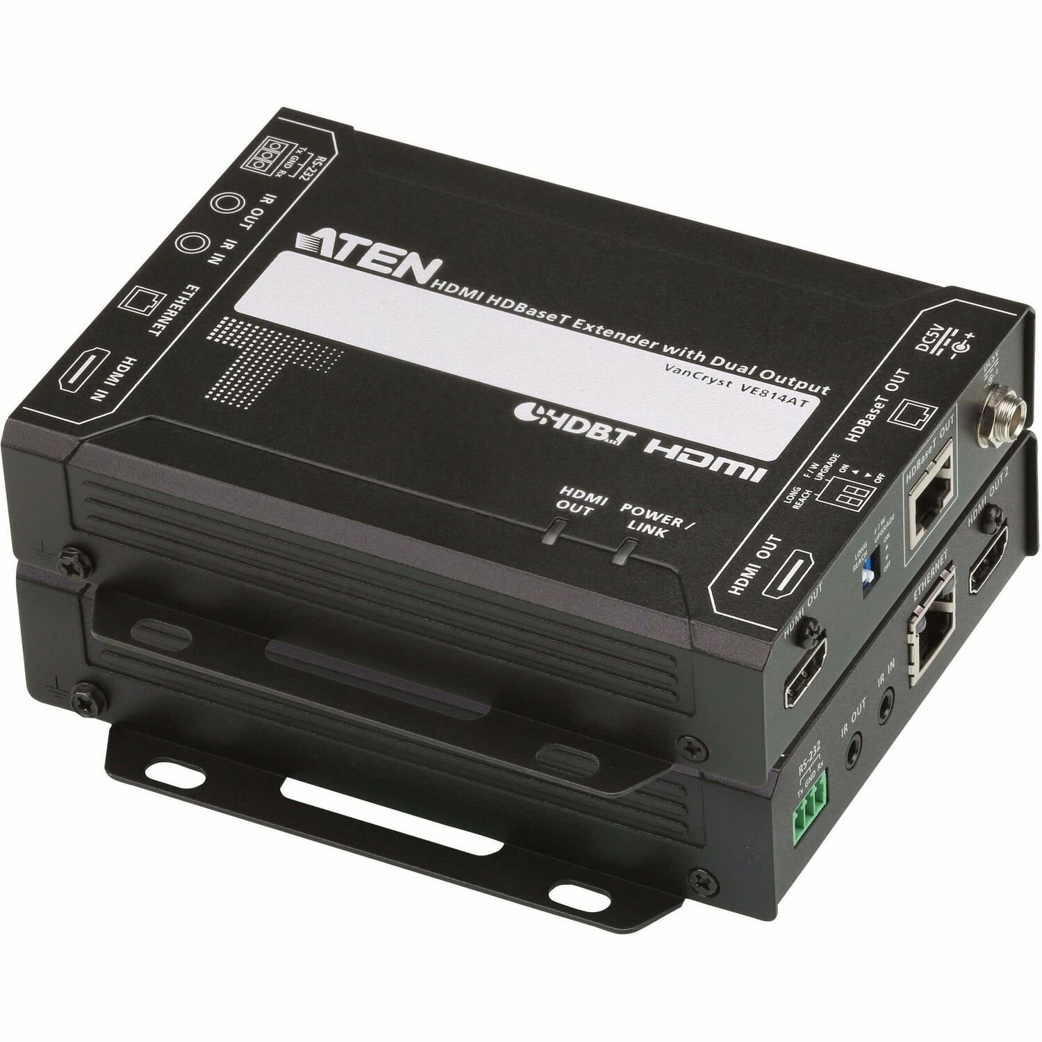 ATEN VE814A is an HDBaseT Video Extender that is capable of sending HDMI signals up to 100 m over a single Cat 5e/6/6a or ATEN 2L-2910 Cat 6 cable. Featuring dual synchronous outputs, the VE814A can transmit video signal to two remote displays and one at the local side. This HDCP 2.2-compliant extender meets the HDMI Specification, including 3D, Deep Color, the maximum data rate of (10.2 Gbps), and 4K video quality up to 100 m.